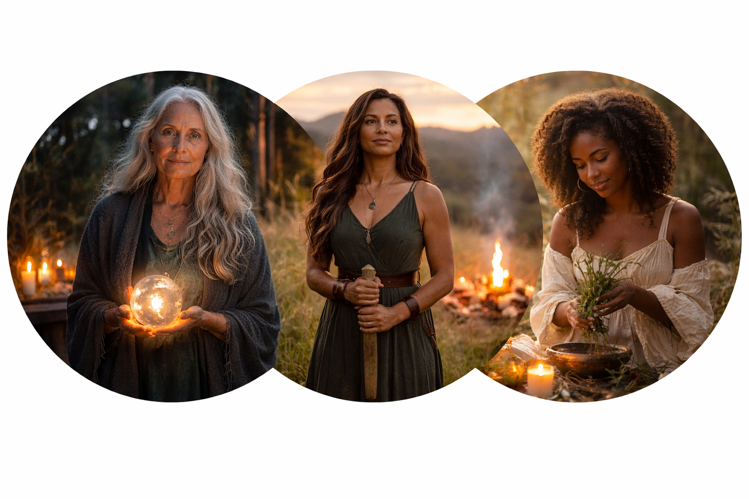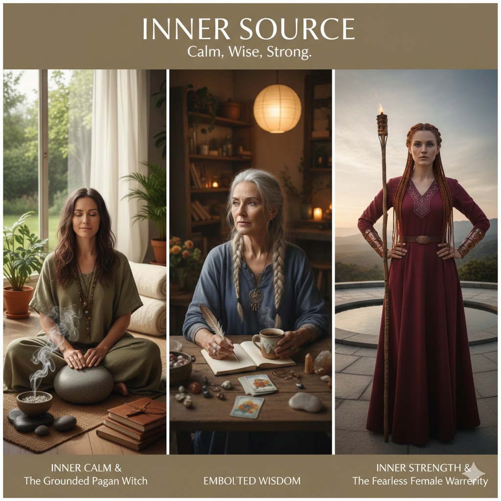 In earth-based spirituality, similar qualities are often personified as different expressions of feminine wisdom and power — the steady knowing of the wise Crone, the clear agency of the fearless warrior, and the grounded, life-affirming presence of the nurturing, grounded pagan witch.